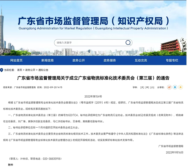 近日,广东省市场监督管理局发布通告,决定成立第三届广东省物流标准化技术委员会(以下简称「标准化委员会」),玉湖冷链执行董事黄铮洪出任副主任委员。