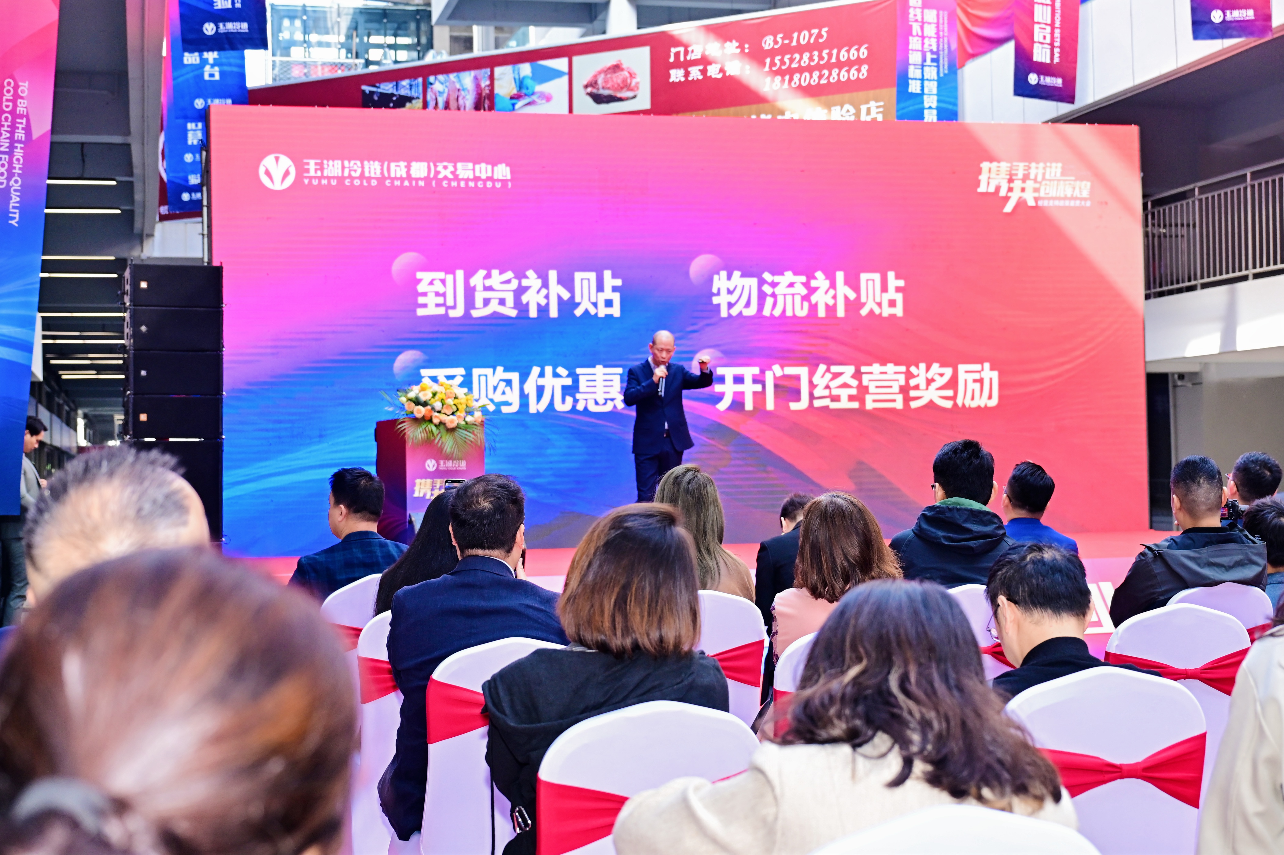 大会由玉湖冷链成都公司董事长王骏致辞开幕,他感谢商户们对玉湖冷链成都园区的信任,并分享了玉湖冷链成都项目自2020年12月落地以来的发展历程,展望了玉湖冷链助力成都打造成承接亚欧、链接全球、覆盖全国的进口冻品门户枢纽的宏图。