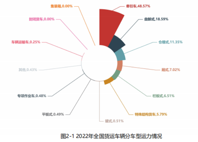 不同类型车辆所占比重是货运车辆运力结构的直观体现。数据显示,2022年,公路货运车辆的车型结构与前两年基本一致,牵引车仍为主要运输力量,占比为48.57%,较去年49.82%略有下降。总体来看,当前我国货运车辆运力结构基本稳定,不同地区有一定显著差异,牵引车为主要运力车型。